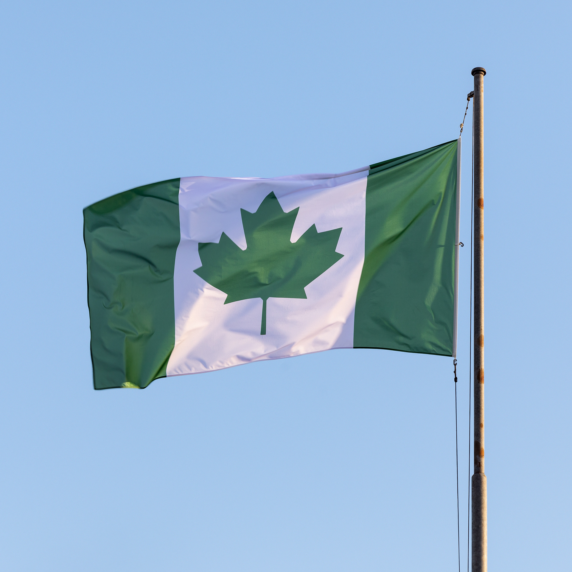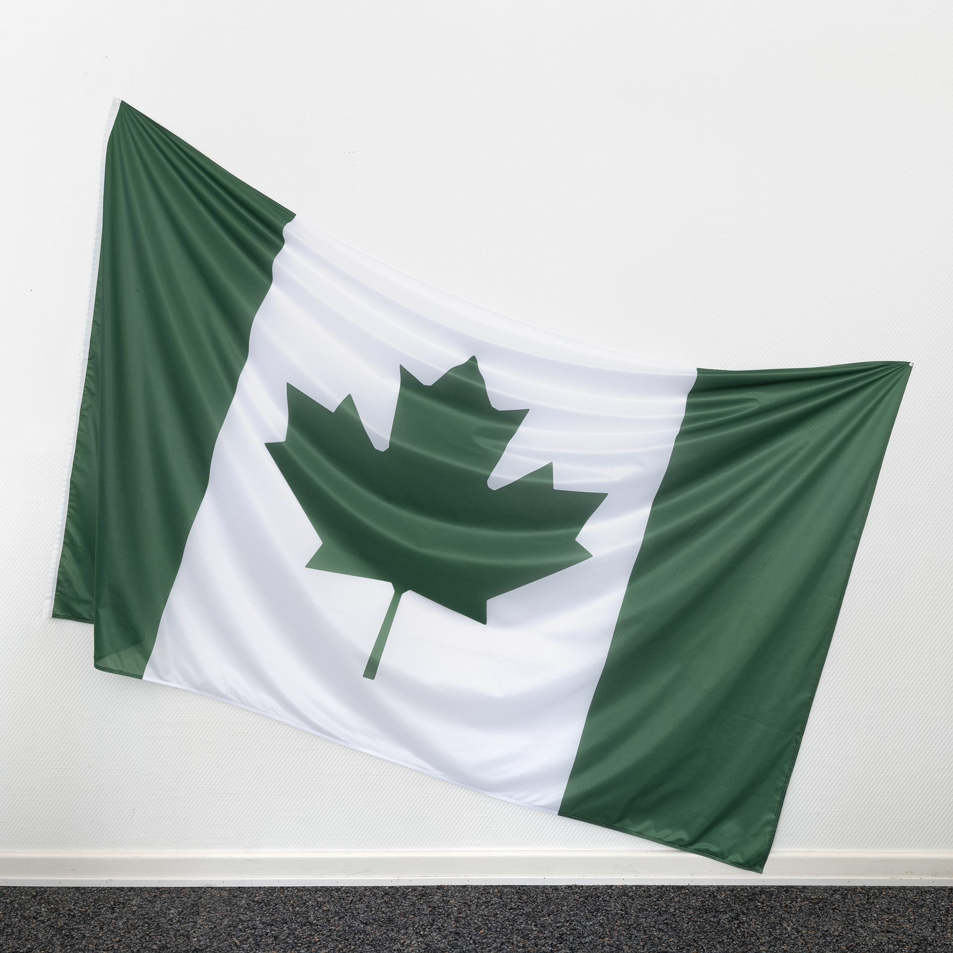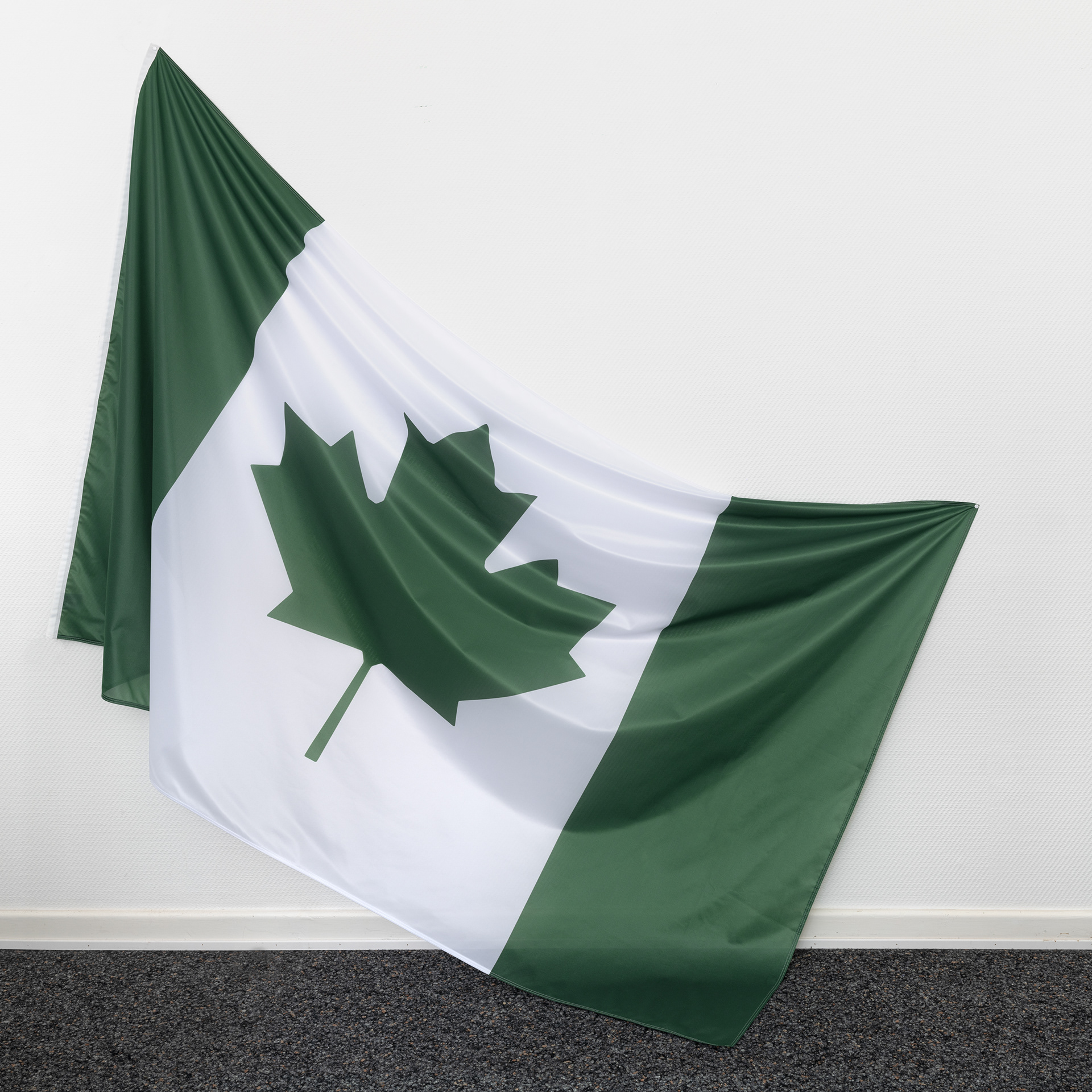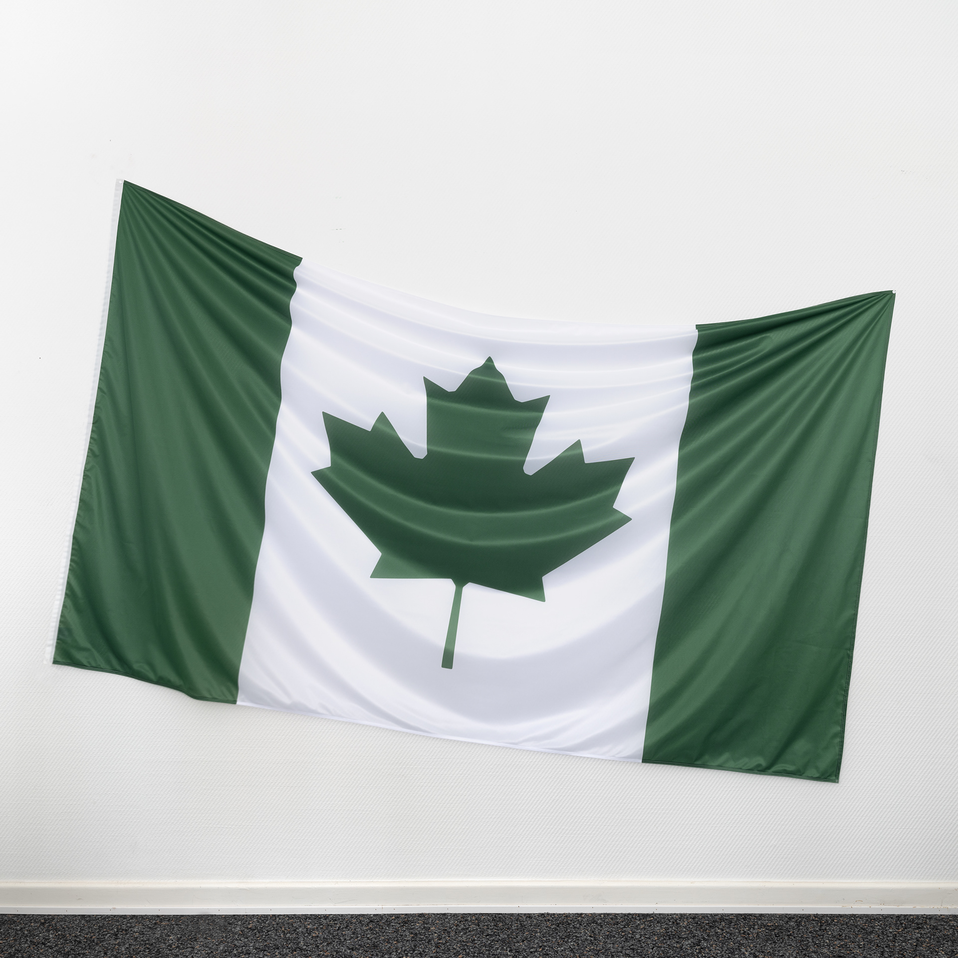 New Nigeria reinterprets the Nigerian flag, which shares formal similarities with the Canadian flag, to comment on migration and brain drain.